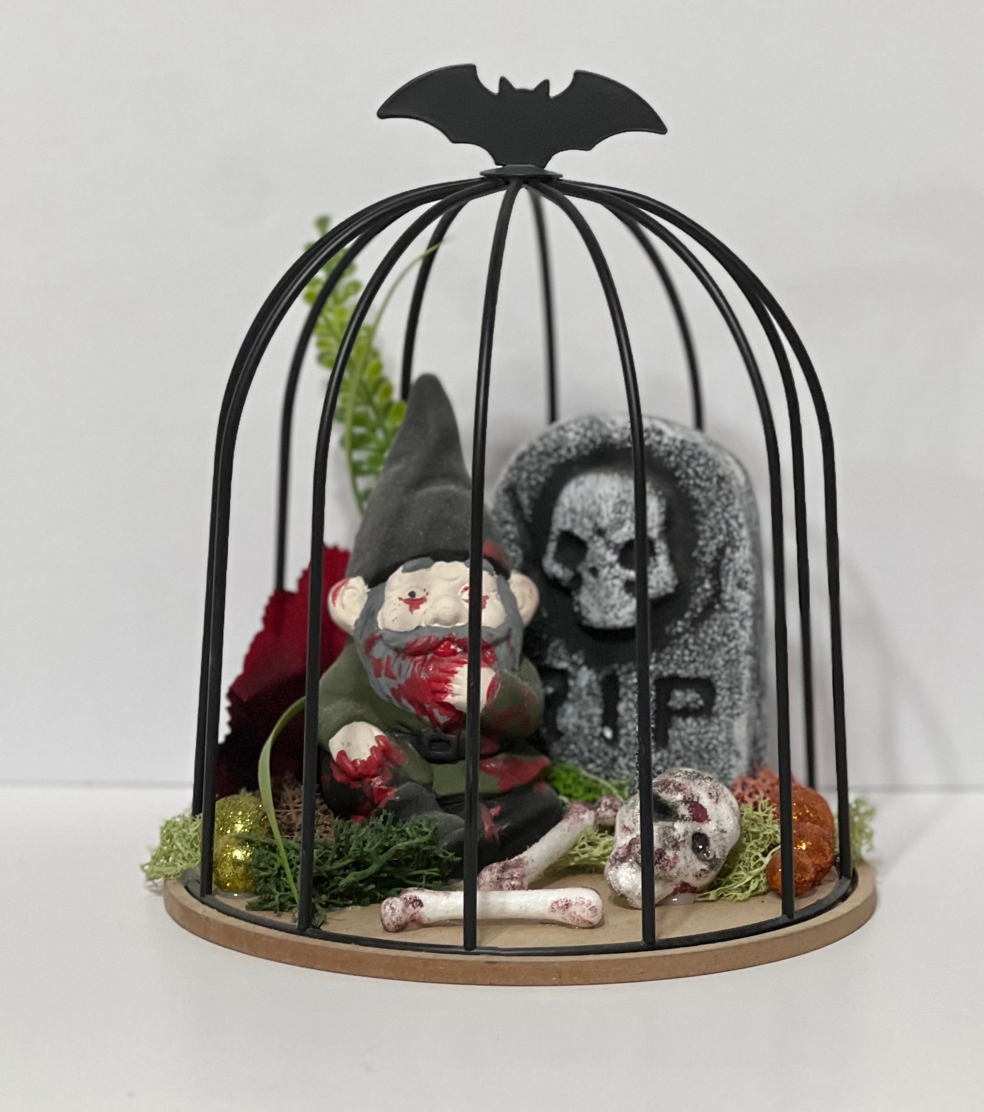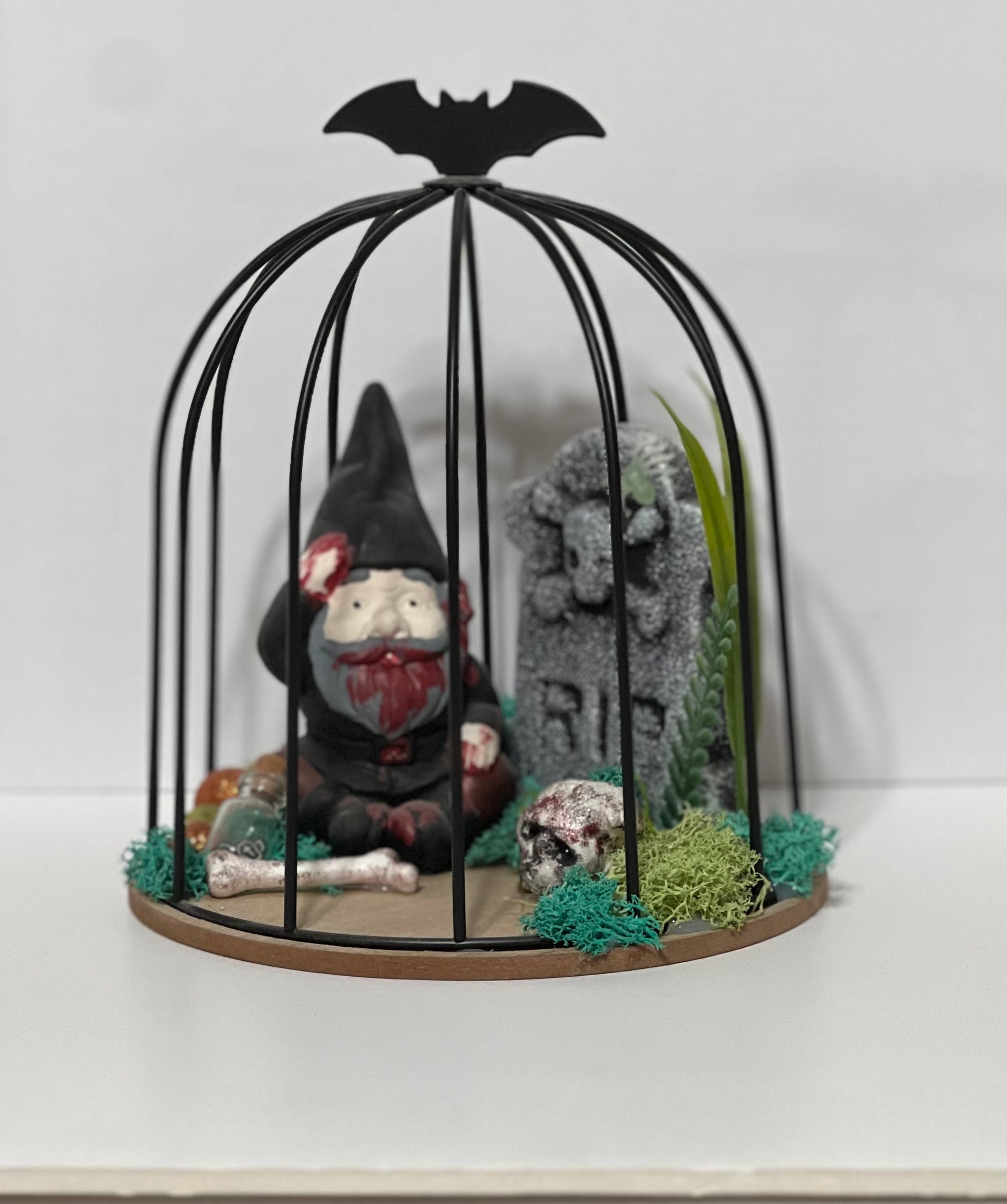 At some point, every garden gnome snaps. These poor little fellows have gone full feral—bloodied beards, haunted eyes, and a taste for bones. To keep the rest of us safe, they now live in cages topped with a bat silhouette, surrounded by tombstones, skulls, and the occasional decorative moss.