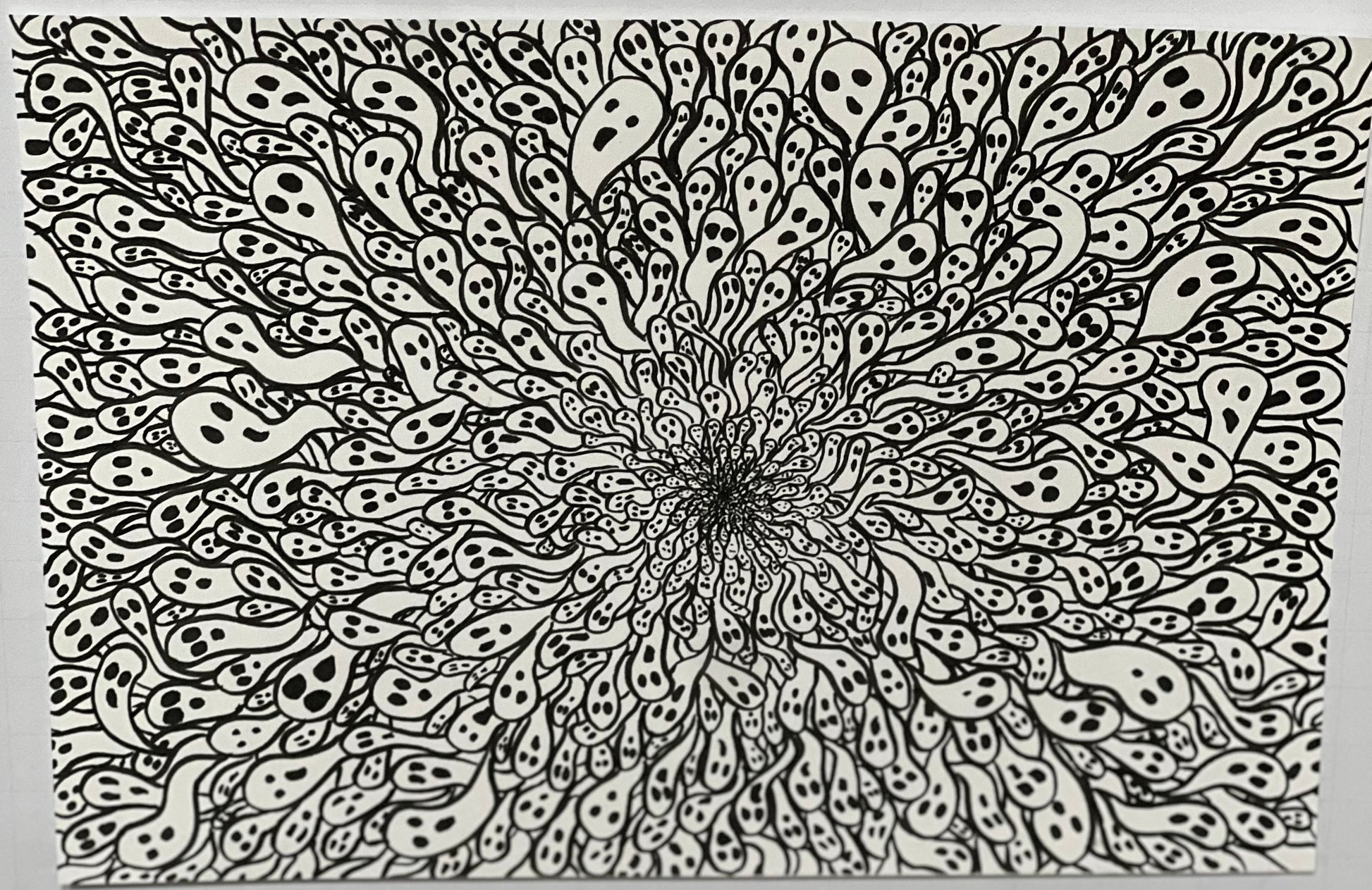 Each design swirls with spectral detail, from ghost swarms to quiet apparitions lurking in the leaves. They’re the kind of drawings that say, “Yes, I collect art. No, it won’t make you feel safe.”